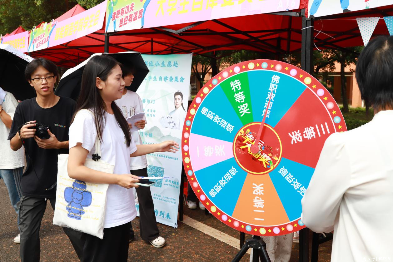 本次活动创新推出的“佛职社团英雄帖”集章活动深受新生欢迎。同学们踊跃前往各社团摊位咨询报名,集满三个印章后参与抽奖,现场气氛热烈。