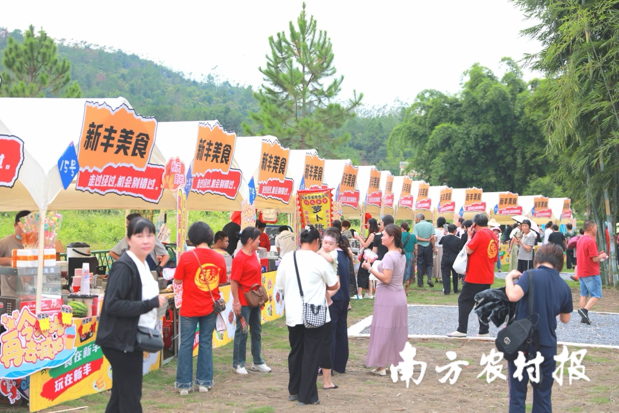 会场精心规划了八大功能区域。其中,农产品展销区与美食展区人气火爆,各镇(街)集中展示主导特色农产品,本地厨师与餐饮企业现场制作并销售本地特色小吃和菜肴,让游客体验“舌尖上的丰收”。现场还邀请电商团队、本地网红与新农人开展直播带货,助推新丰农产品出村进城、走向更广阔市场。